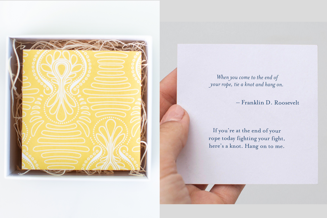 Upon opening our signature dove gray lidded gift box, she’ll find a yellow card that explains the Rainy Day Box concept: these gifts are meant to be saved and opened on four of her toughest days. You can add a short personal message (handwritten by us) to this card at checkout.