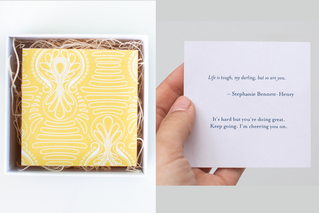 Upon opening our signature dove gray lidded gift box, she’ll find a yellow card that explains the Rainy Day Box concept: these gifts are meant to be saved and opened on four of her toughest days. You can add a short personal message (handwritten by us) to this card at checkout.