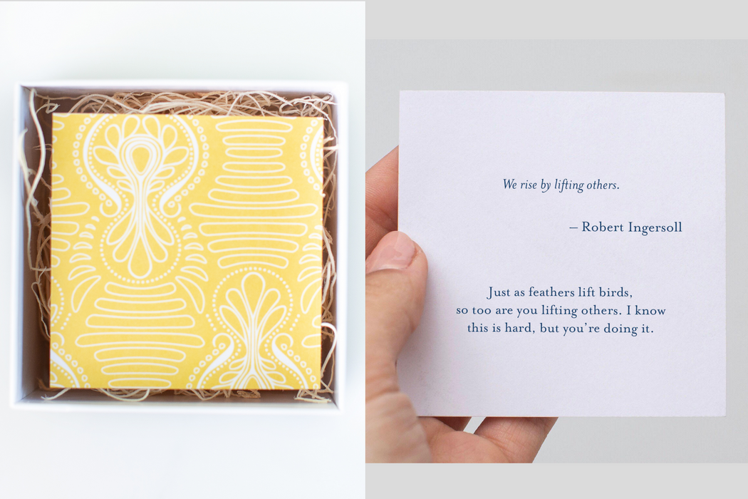 Upon opening our signature dove gray lidded gift box, she’ll find a yellow card that explains the Rainy Day Box concept: these gifts are meant to be saved and opened on four of her toughest days. You can add a short personal message (handwritten by us) to this card at checkout.